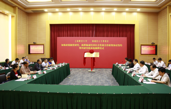 随后,蒋传海校长和魏伟明主任代表双方签订关于加强政策制度研究,助推杨浦经济社会发展合作框架协议。丛树海书记和李跃旗书记为上海财经大学、杨浦区人大常委会科研实践基地揭牌。