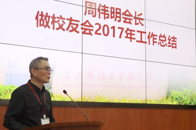 接着由公管校友会会长周伟明做2017年校友会工作总结,2017年公管校友会主要围绕在校生求职、公益捐赠、上财百年、与各地方校友会互动四方面做出了优异的成绩,周会长向参会理事汇报了公管校友会在2017年荣获优秀校友会与捐赠数额排名全校第一的佳绩。