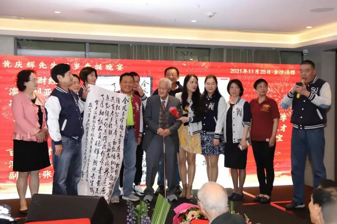上海财经大学校友总会在给黄老的百岁寿诞贺信中,特别高度评价了黄老校友为母校校友会工作所做的贡献:“跨越百年,学校已顺利进入国家’双一流’项目建设高校行列,正努力向着具有鲜明财经特色世界一流大学的目标迈进。作为上财校友,您见证了母校的变迁,并以多种形式支持学校的教育事业发展。2015年,上财澳大利亚校友会成立之初,您便担任澳大利亚校友会名誉顾问,作为老校友代表发言并向澳大利亚校友会赠送亲笔书写的对联和诗。2017年初,上财百年校庆筹备之时,您特意赶赴澳洲校友会欢庆现场,挥毫祝贺上财桃李芬芳满天下,还在悉尼歌剧院前参与录制了百年校庆的祝福视频。上财百年校庆纪念大会当天,96岁高龄的您专程从澳洲飞回上海,作为最年长的返校校友参加校庆典礼,并向母校捐赠书籍字画。您以您的行动充分展现了对母校的浓浓情意,我们向您表示崇高的敬意和由衷的感谢”。